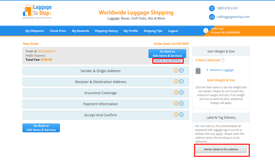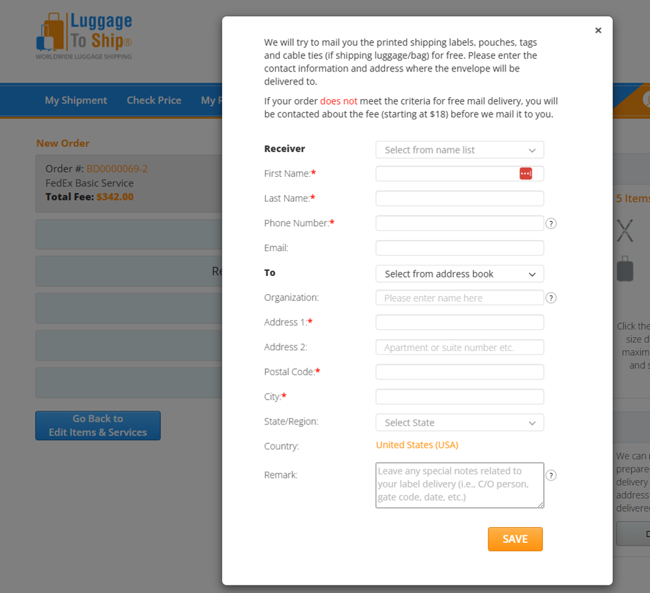To request that LuggageToShip mails your shipping labels to you, follow these steps: